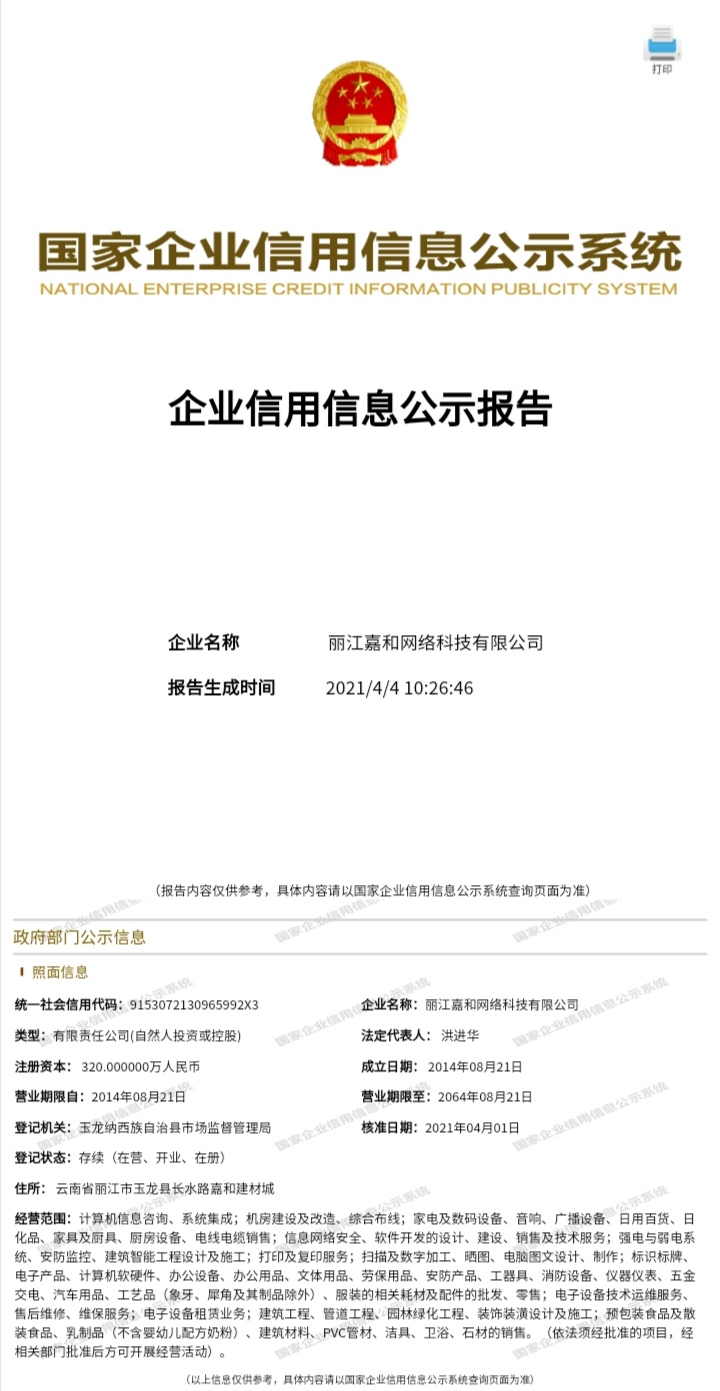 時間:2021/4/4 10:31:07 公司名:麗江嘉和網絡科技有限公司 瀏覽量: