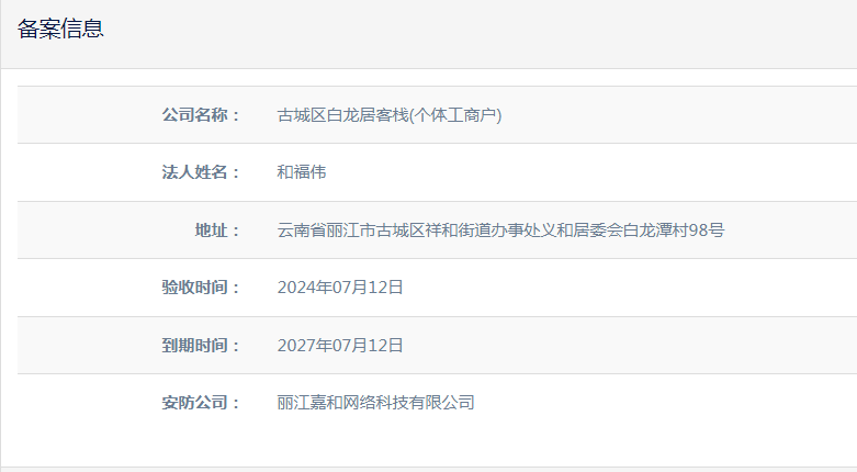 關于古城區白龍居客棧(個體工商戶)電子監控安防合格證下證通知