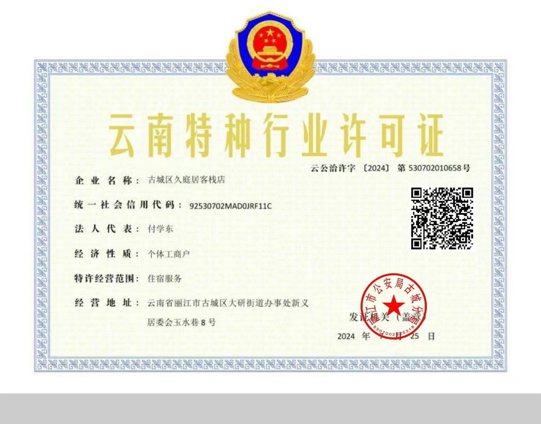 關于古城區久庭居客棧店電子特種行業許可證下證通知