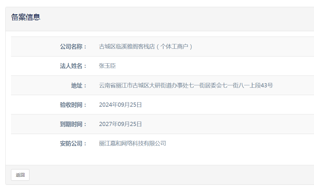古城區臨溪雅閣客棧店(個體工商戶)電子監控安防合格證下證通知