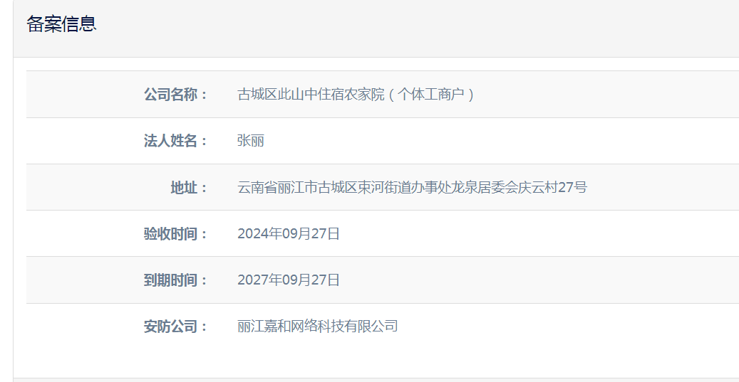 古城區(qū)此山中住宿農(nóng)家院(個(gè)體工商戶(hù))電子監(jiān)控安防合格證下證通知