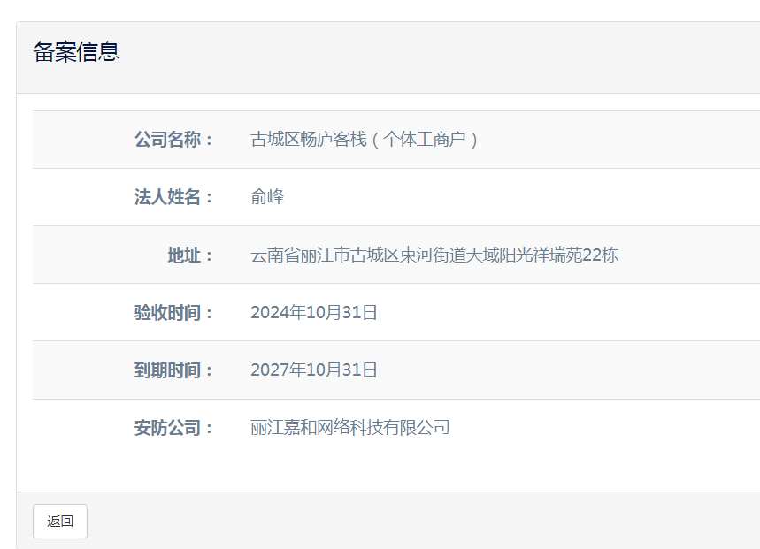 關于古城區暢廬客棧(個體工商戶)電子監控安防合格證下證通知