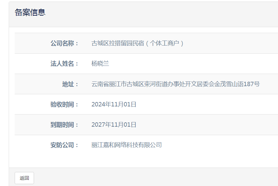 關于古城區拉措留園民宿(個體工商戶)電子監控安防合格證下證通知