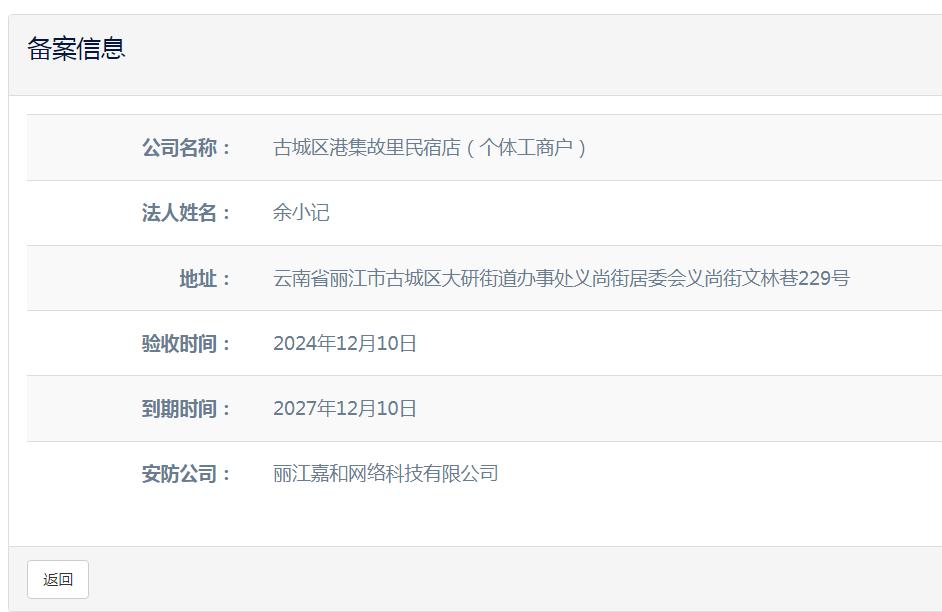 關于古城區港集故里民宿店(個體工商戶)電子監控安防合格證下證通知