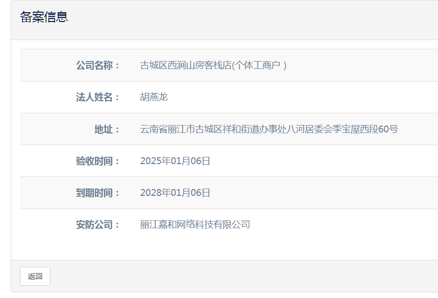 關于古城區西澗山房客棧店(個體工商戶)電子監控安防合格證下證通知