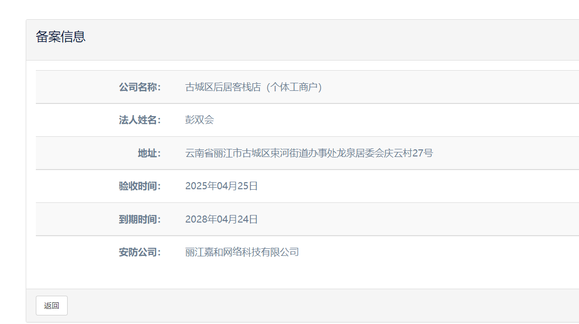 關于古城區(qū)后居客棧店(個體工商戶)電子監(jiān)控安防合格證下證通知
