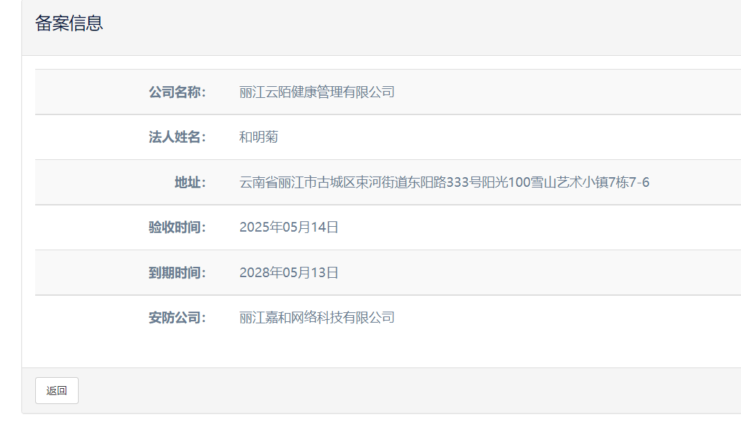 關于麗江云陌健康管理有限公司電子監控安防合格證下證通知