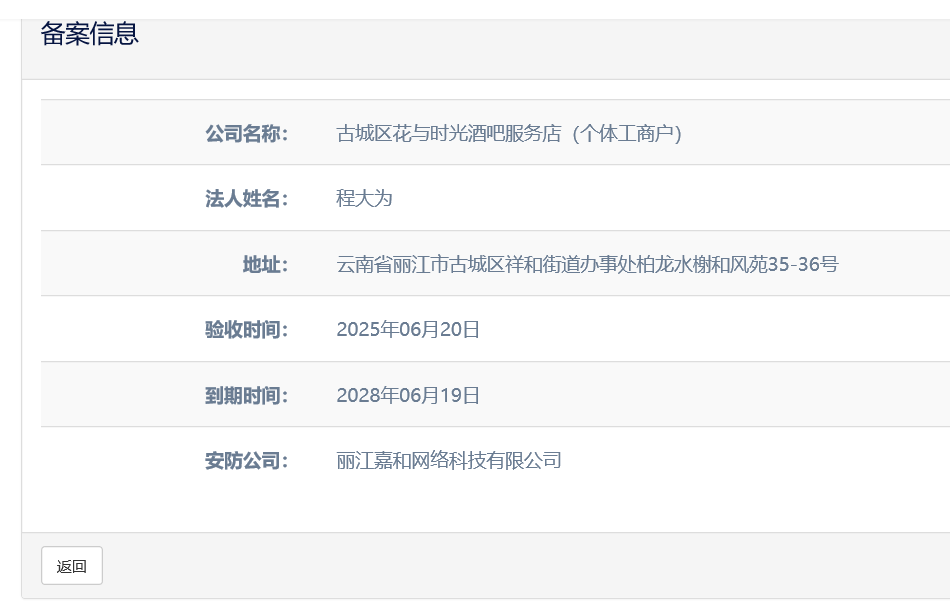 關(guān)于古城區(qū)花與時(shí)光酒吧服務(wù)店(個(gè)體工商戶)電子監(jiān)控安防合格證下證通知