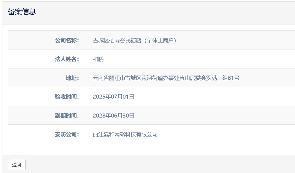 關于古城區棲雨谷民宿店(個體工商戶)電子監控安防合格證下證通知