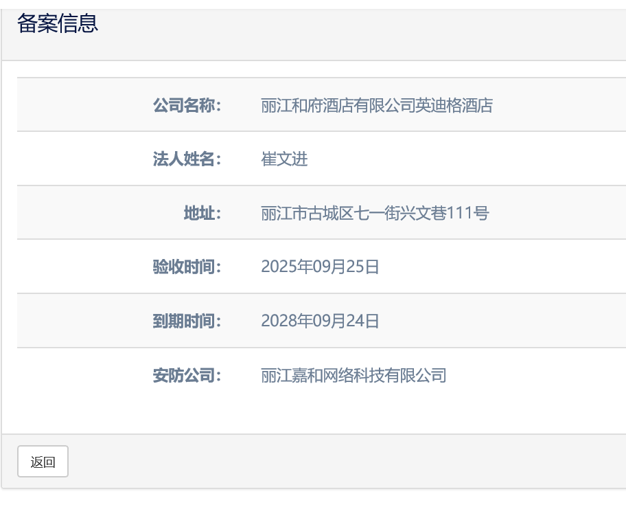 關(guān)于麗江和府酒店有限公司英迪格酒店電子監(jiān)控安防合格證下證通知