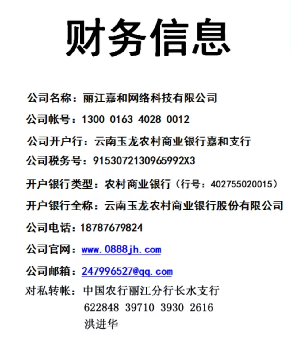 對公名稱:麗江嘉和網絡科技有限公司,公司帳號:1300 0163 4028 0012,開戶行:云南玉龍農村商業銀行股份有限公司